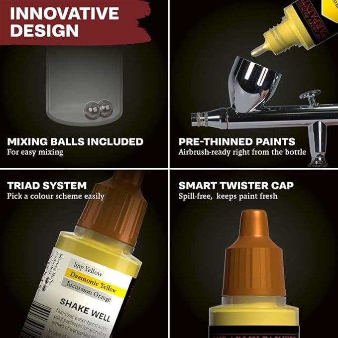 This bundle includes 2 color air triads with 6 x 18ml pre-thinned acrylic airbrush paints. Perfect for D&D and Warhammer miniatures.